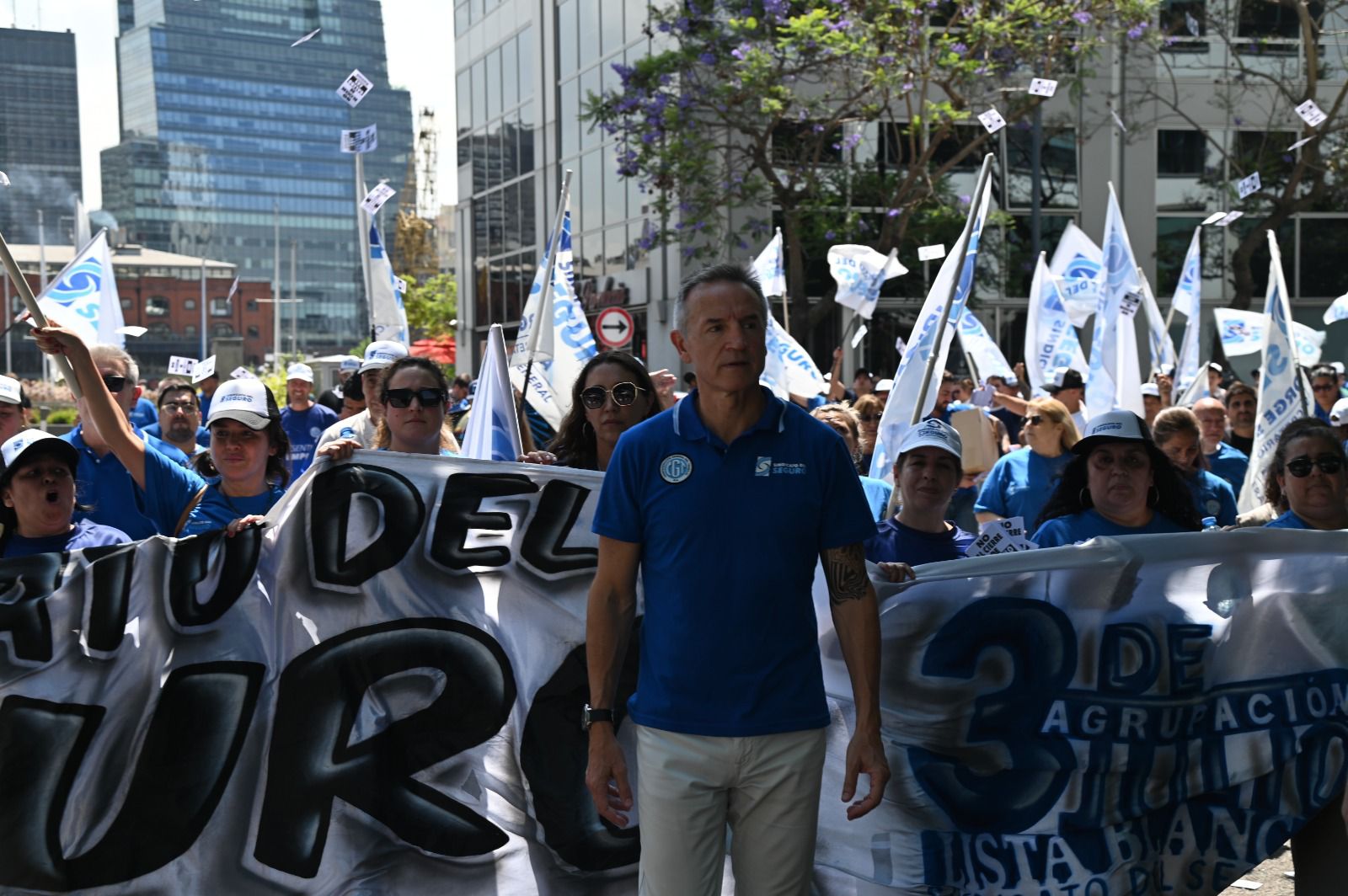 Jorge Sola, secretario general de la CGT, encabezó la protesta frente a la empresa en Puerto Madero y declaró el estado de alerta nacional para exigir el pago de salarios y la continuidad operativa