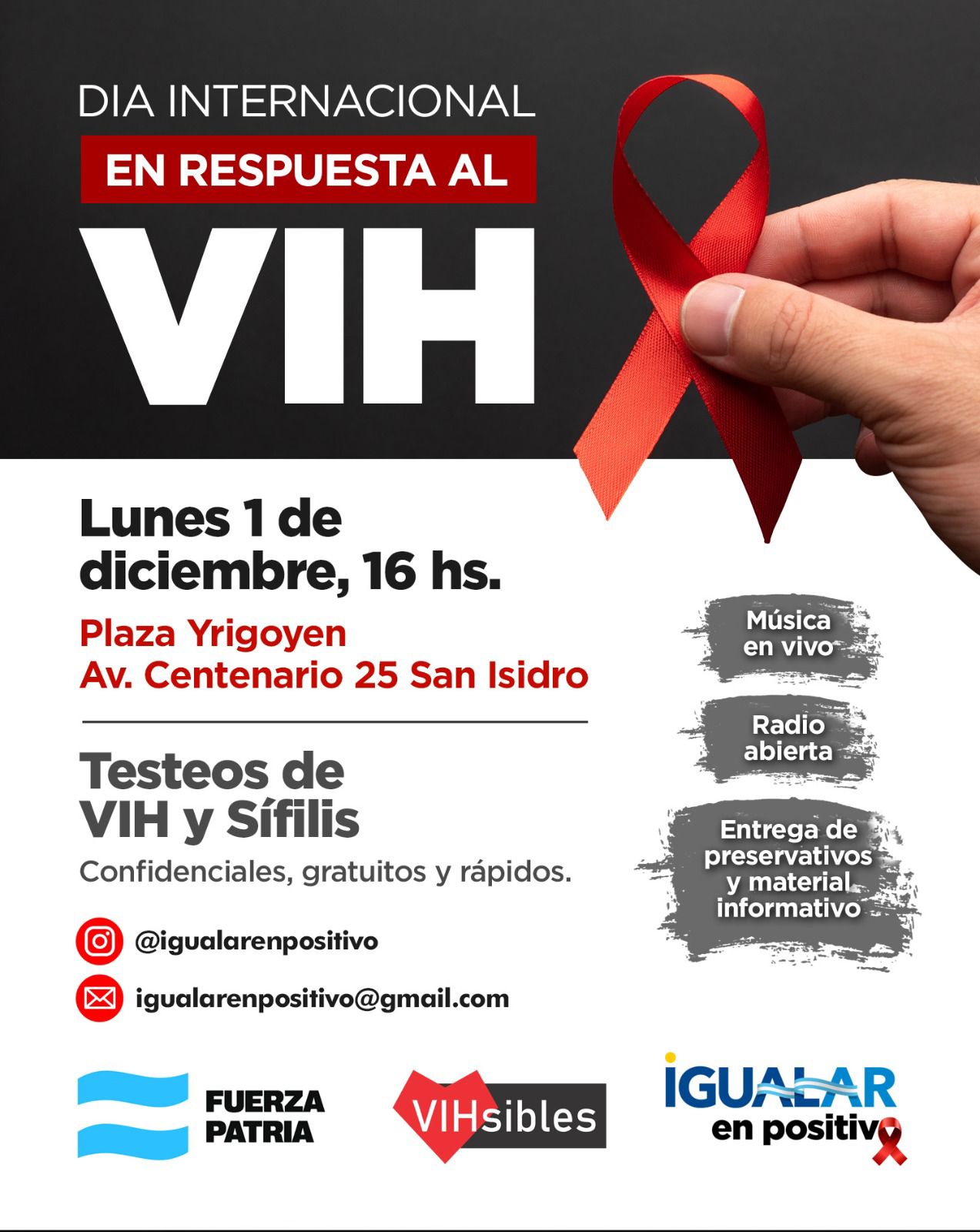 La organización VIHsibles Argentina realizará controles confidenciales en la Plaza Yrigoyen este 1° de diciembre - La convocatoria incluye una radio abierta y la participación de colectivos sociales y sindicales